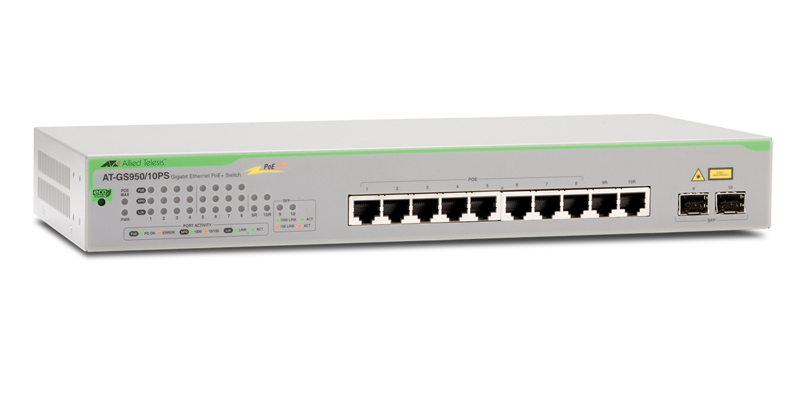 The Allied Telesis AT-GS950/10PS Gigabit Ethernet WebSmart switch features two Gigabit ports, two SFP combo ports, and eight PoE+ ports delivering up to 30 Watts per port to support video surveillance and security cameras, wireless access points, IP phones and other PoE powered devices. The PoE option eliminates the need for power rewiring and minimizes the clutter of power supplies and adapters in awkward places. Thanks to its compact size, the AT-GS950/10PS is ideal for wiring-constrained and smaller environments such as micro branch offices, classrooms, cafes, and smaller retail stores.